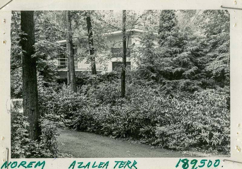 Contemporary house built in 1964 partially obscured by trees and rhododendrons along its driveway.Collection