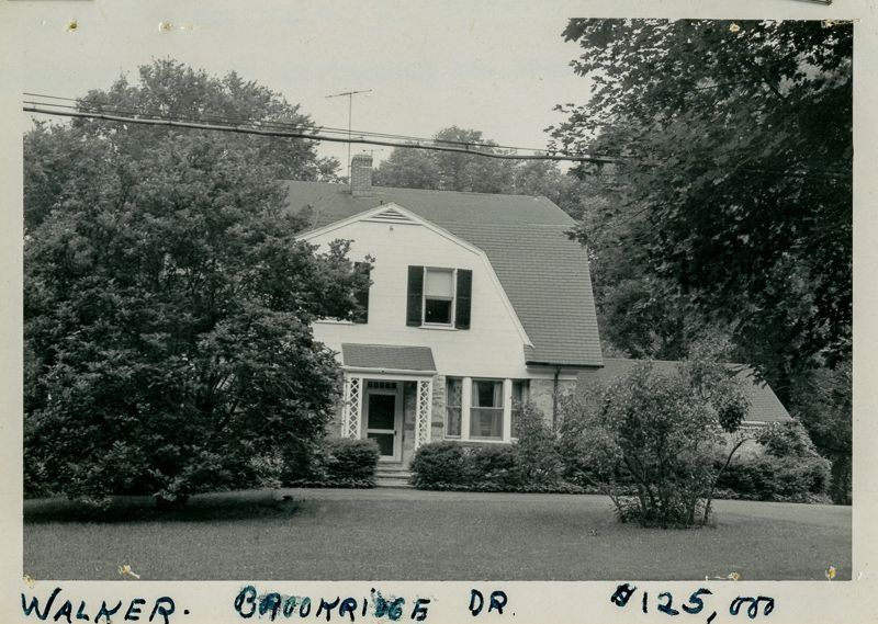 Dutch colonial-style house with gambrel-style roofing built in in the first decade of the 1900's but remodeled in 1948, viewed from its lawn.Collection