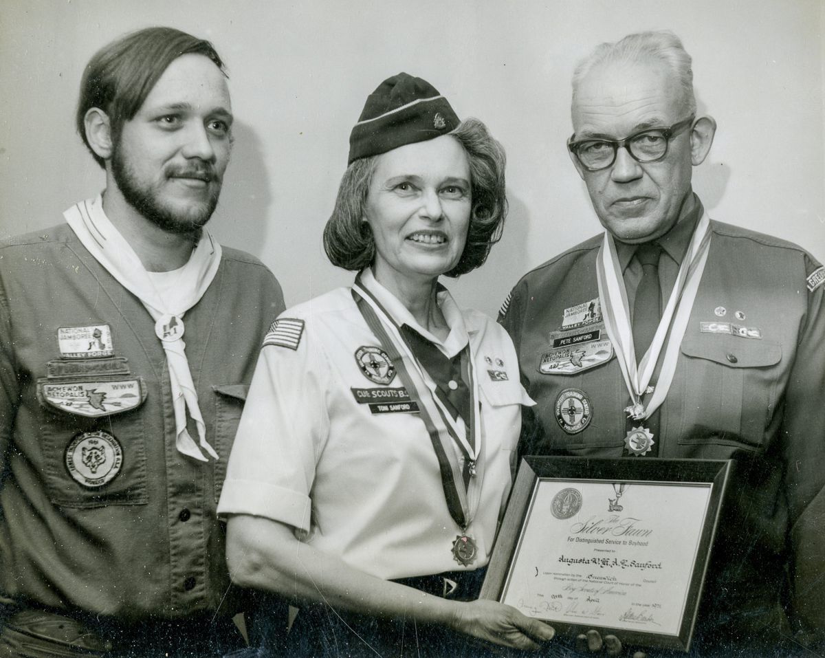 Augusta Sanford posing with her husband and son after being awarded The Silver Fawn from the Boy Scouts of America. The Silver Fawn was only awarded from 1971 to 1974 as the female equivalent of The Silver Beaver award; when, in 1974 men and women became eligible for the Silver Beaver, the Silver Fawn was discontinued.Collection