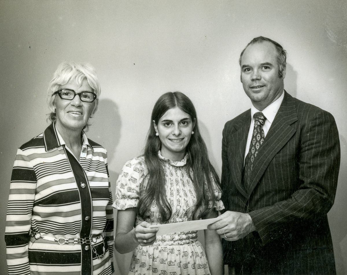 A man handing a teenage girl a scholarship with a women standing next to them.