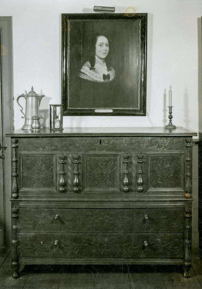 A Hadley chest with a portrait of a woman done by Abraham Ragueneau (a French artist) above it.Collection