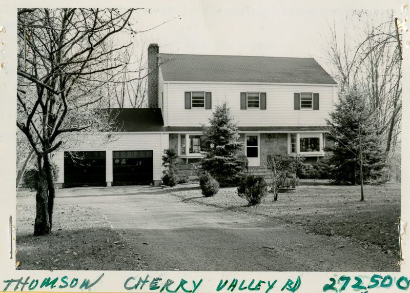 Colonial-style house built in 1955 with a two door garage viewed from its driveway.