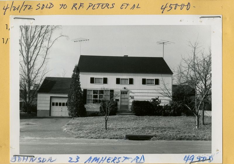 Small two story house built in 1960 with an attached garage viewed from the street.