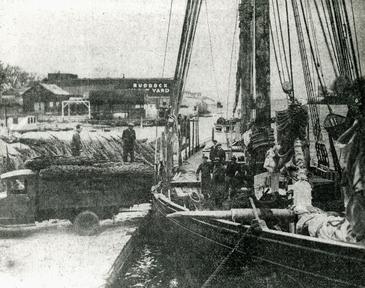 Boat being loaded in Greenwich Harbor; Ruddock Boat Yard can be seen in the background.Collection