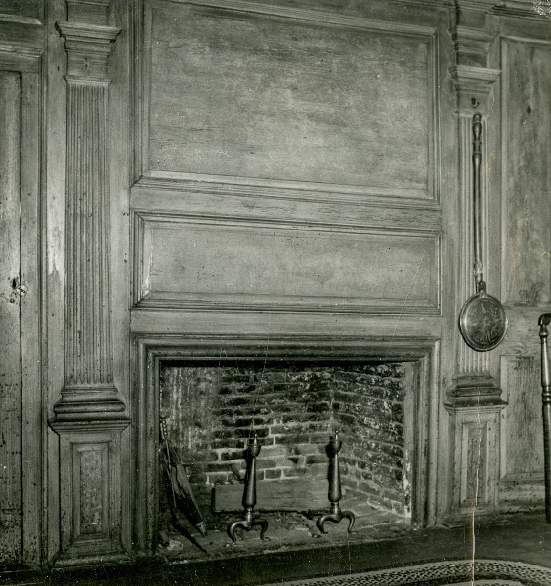 Fireplace in the main chamber/ master bedroom on the second floor of the Bush-Holley House; a bed-warmer is hanging on the wall by the fireplace.Collection
