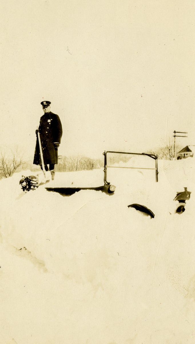 Police Officer Carl Johnson standing with a snow shovel, digging out a snow-filled car.