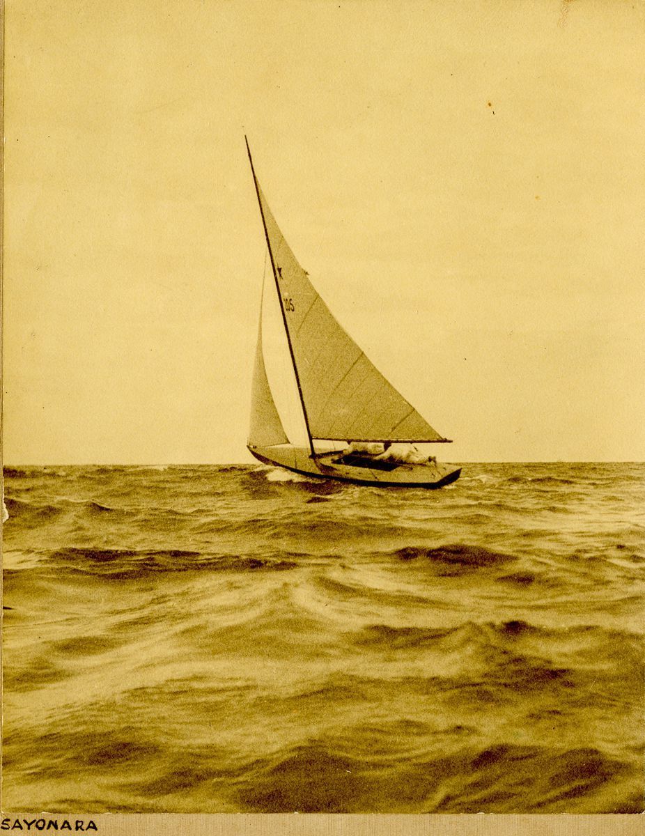 The "Sayonara," a "Star class" racing boat with its two crew-members lying prone on one side of its hull.