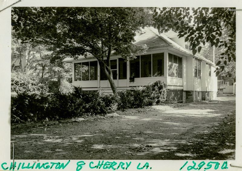 Shore colonial built circa 1929 with a screened in porch viewed from its driveway.