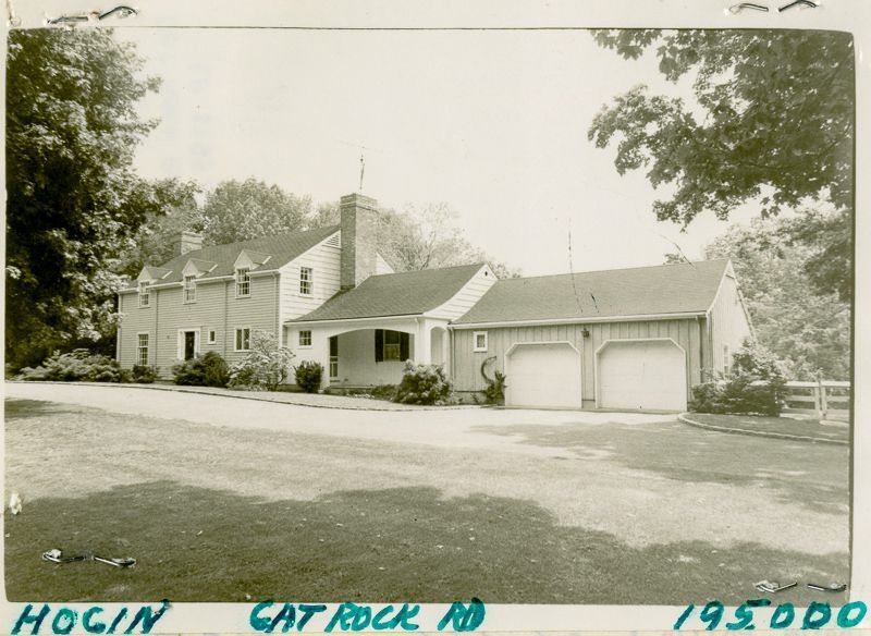 Colonial-style house built in 1958 with a recently added two door garage viewed from its lawn.