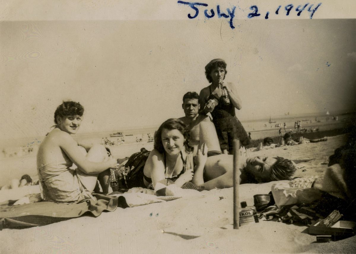 From left to right: Jane Insinga, Dottie O'Connor, Michael Belicka, Bill Geraghty and Frances Geraghty laying on the beach at Greenwich Point.Collection