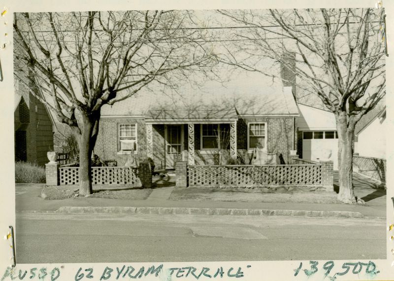 Cape style house built in the 1950's with brick walls and a low brick wall around its front yard viewed from the street.Collection