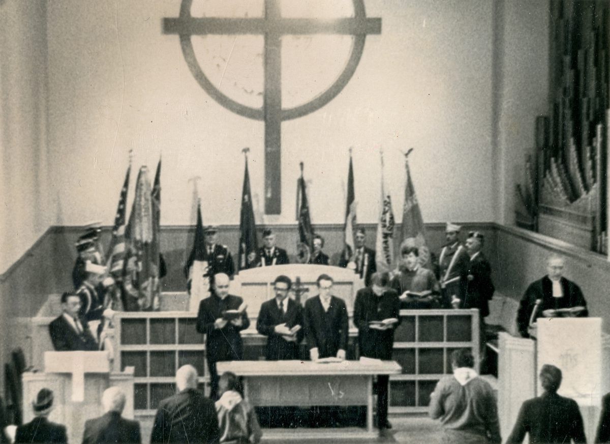 An interior view of the First Presbyterian Church looking towards the pulpit with people in uniforms holding flags behind members of the clergy.Collection