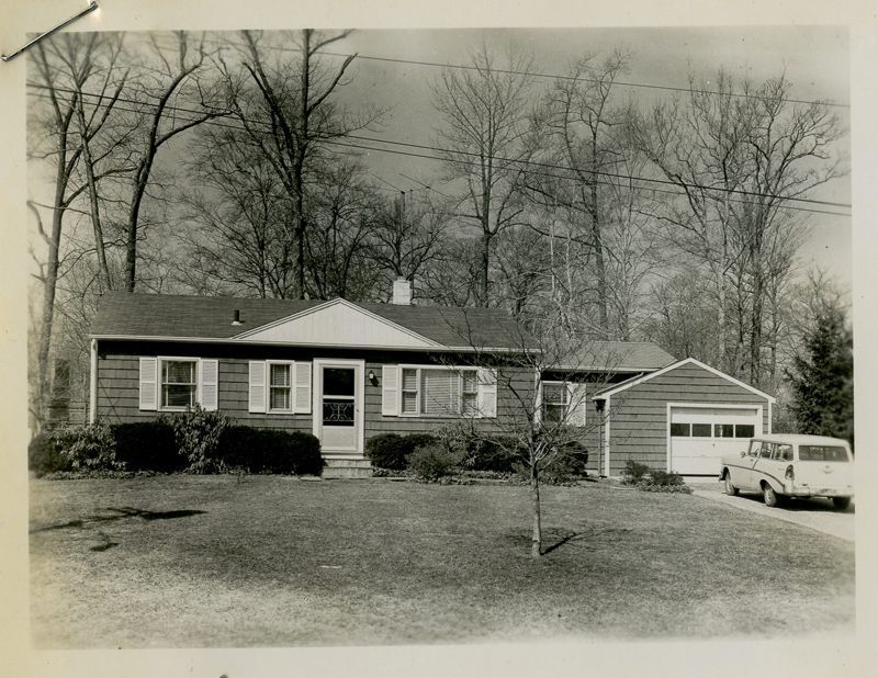 Ranch house built in 1953 or 1952 with a car parked in its driveway viewed from its lawn.