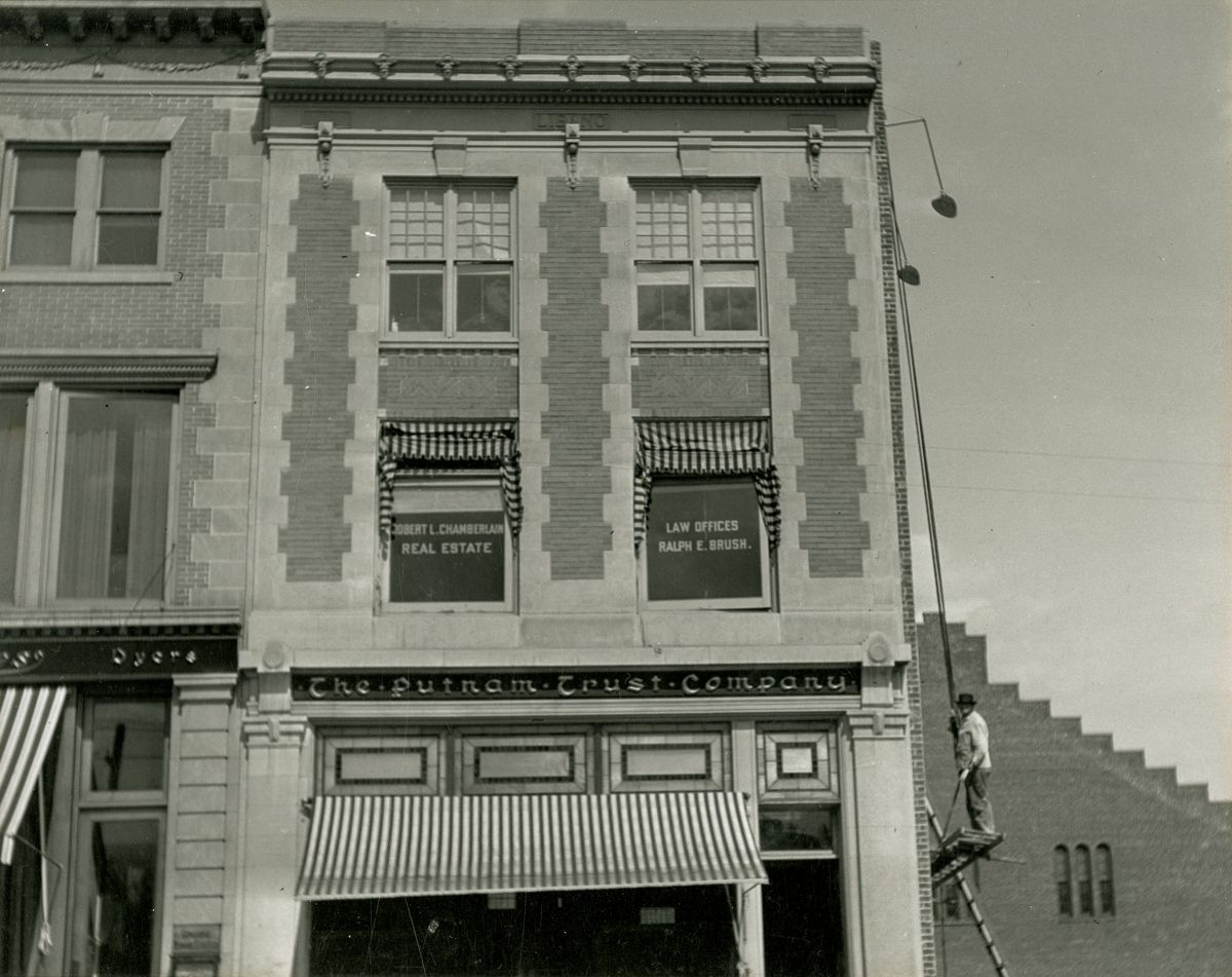 Facade of the Putnam Trust Company's building; the offices of Robert L. Chamberlain's real estate agency and Ralph E. Brush's law office are above it. A construction worker or window washer is standing on a platform on the side of the building.Collection