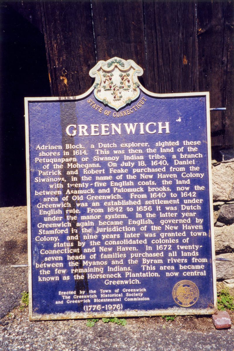 A sign erected to commemorate the Bicentennial describing the early history of Greenwich, photographed outside the barn on the campus of Greenwich Historical Society when it was being taken to storage by Greenwich's Department of Public Works.Collection