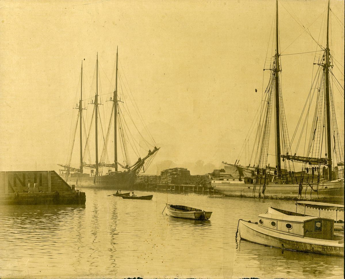 View of Maine schooners unloading lumber at the Maher Brother's yard on Steamboat Road; a Dr. Bennet's motor boat can be seen in the right foreground.Collection
