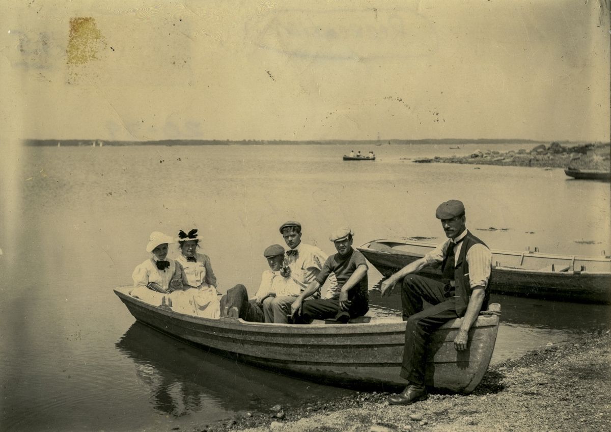 A group of people posing on a rowboat on the shore of Cos Cob.