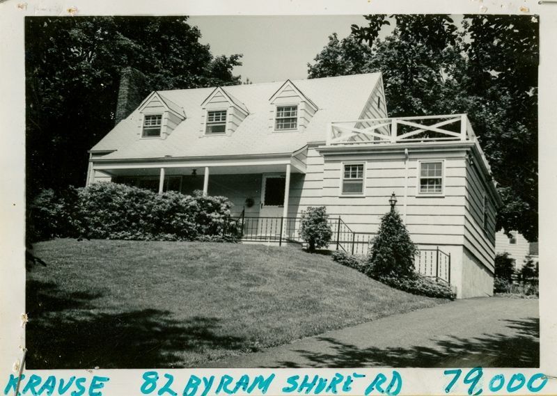 Colonial Cape house built in 1941 with three small dormers and a deck viewed from its driveway.