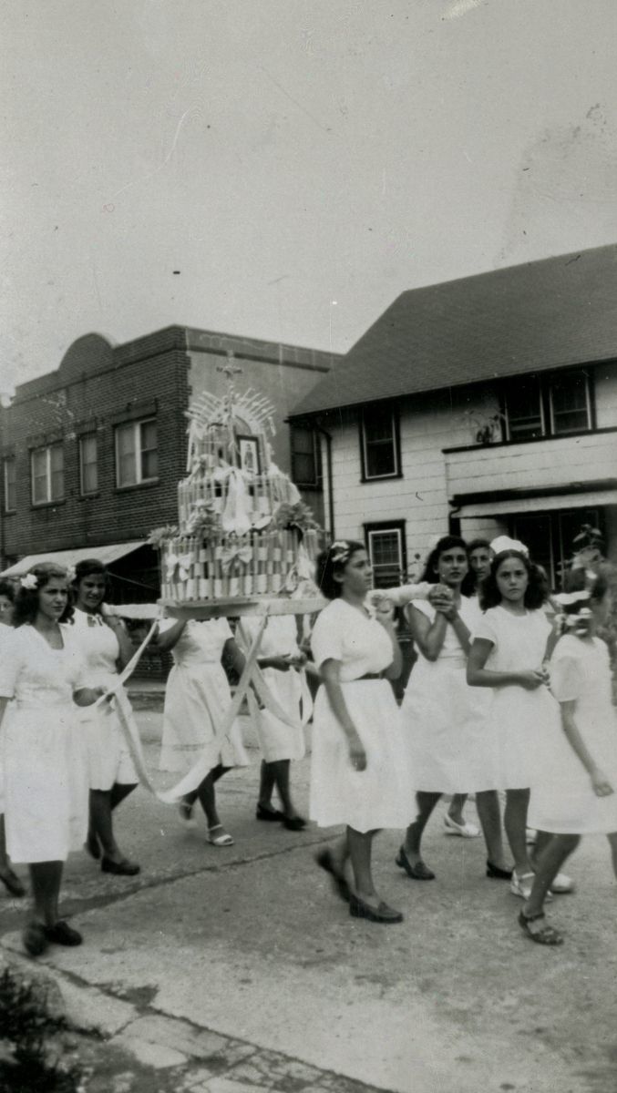 Girls carrying a bier in a procession celebrating Saint Roch's Feast Day.