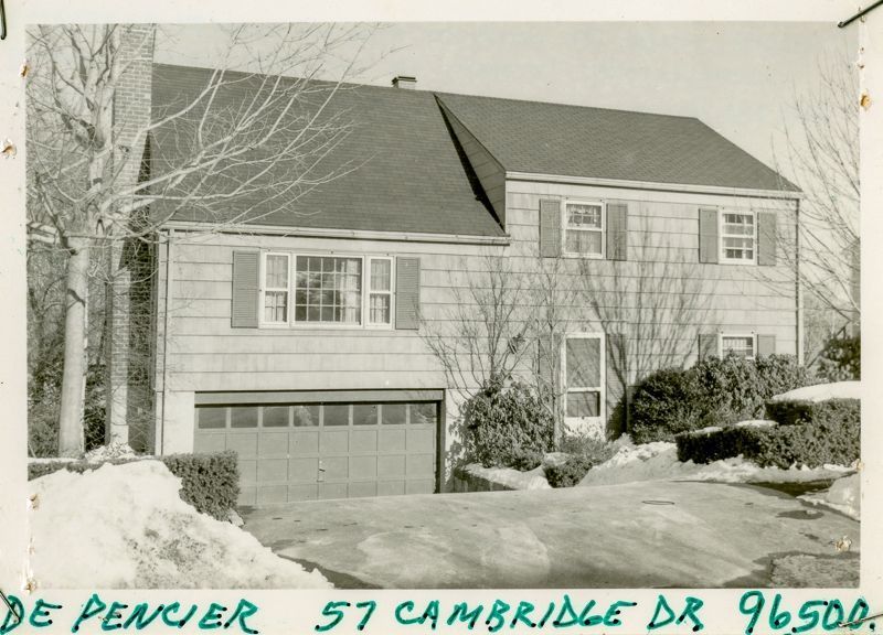 Split-level built circa 1966 with a garage and shingle siding viewed from the street.