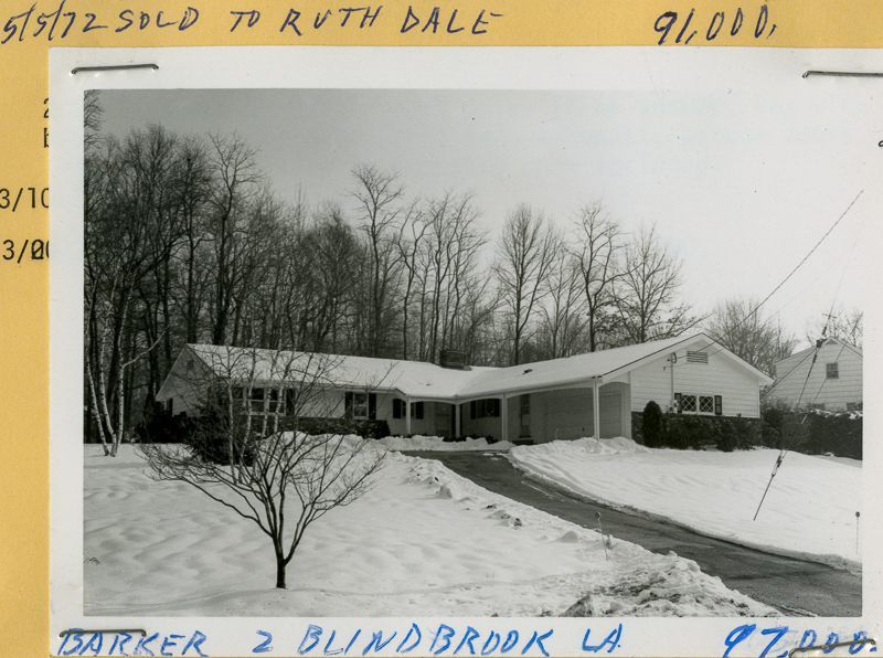 Single story ranch house built in 1963 in the snow, viewed from the street.