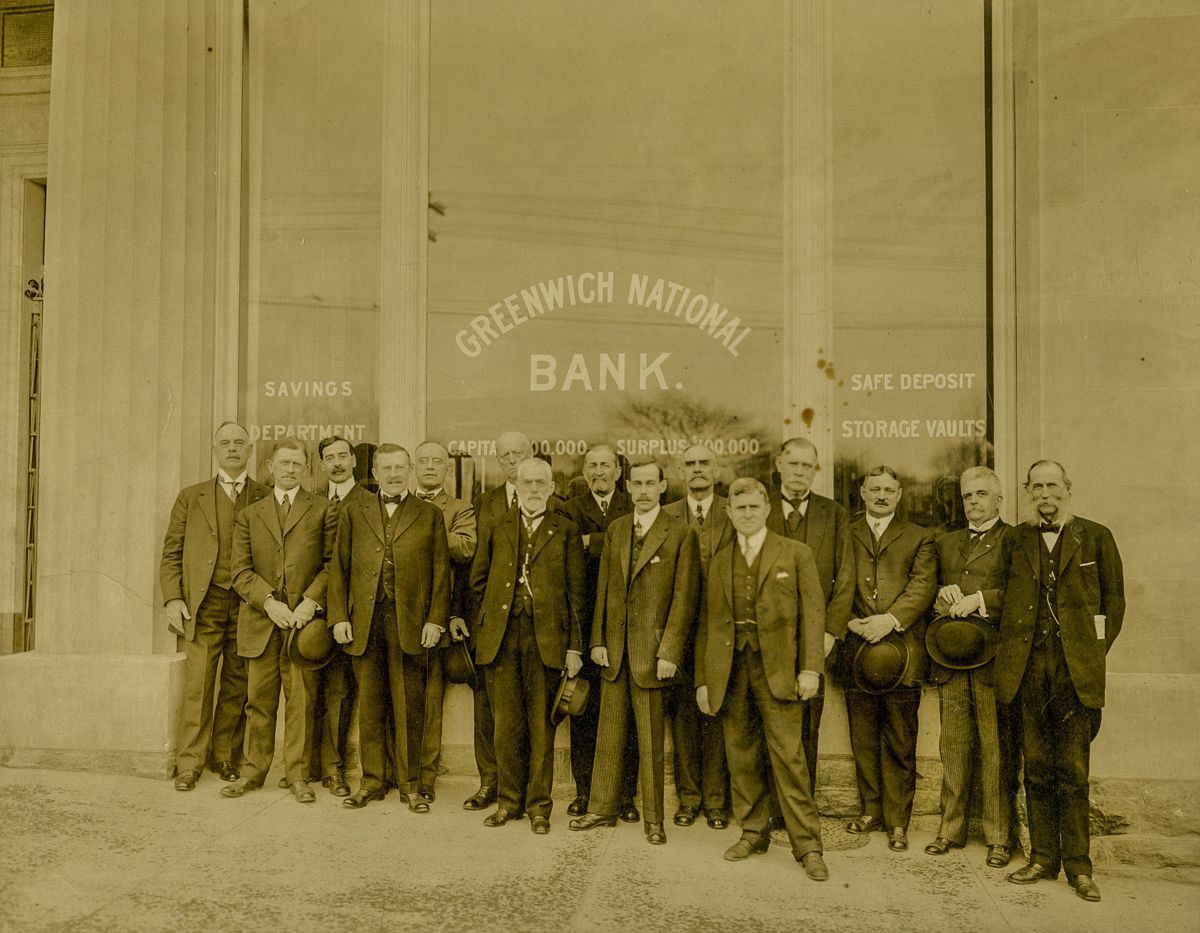 Board of the Greenwich National Bank standing in front of its offices in the Smith Building.