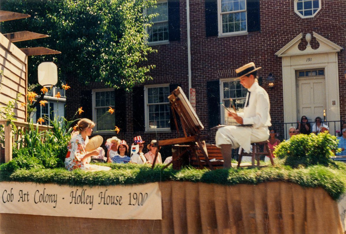A float depicting the Cos Cob Art Colony and the Bush-Holley House in 1900; the float is participating in a parade celebrating the 350th Anniversary of Greenwich's Founding.Collection