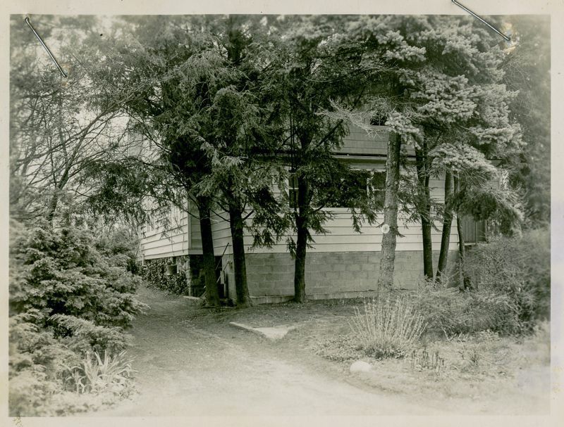 House with cinderblock foundations, largely obscured by pine trees, viewed from the street.