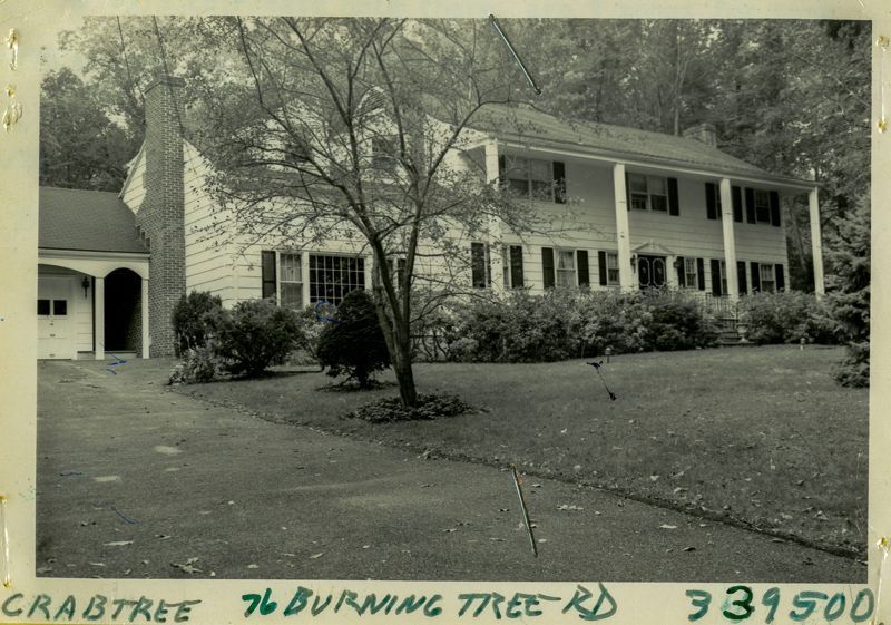Two-story Georgian colonial style house built in 1964 with a portico viewed from its driveway.
