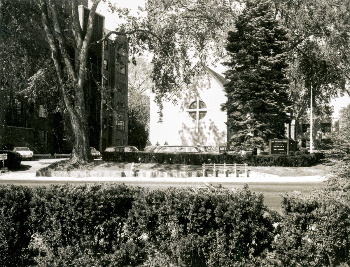 A view from across West Putnam Avenue of the First Presbyterian Church after its 1955 renovations.