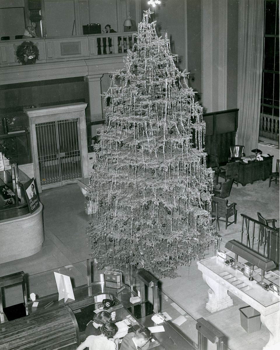 A large, decorated Christmas tree in the interior of the Putnam Trust Company's Greenwich Avenue location.Collection