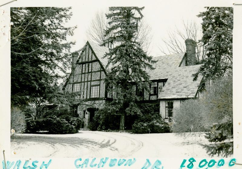 Tudor-style house built in the 1920's with a slate roof viewed from its snowy driveway.