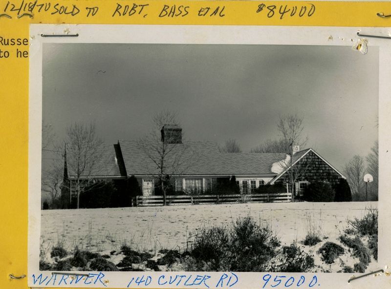 Colonial-style house built in 1961 viewed from its snowy lawn.