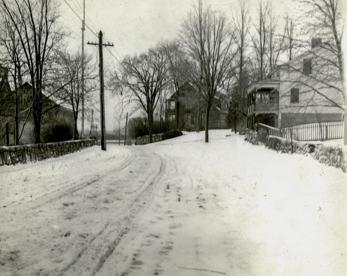 Looking south along Strickland Road with the Bush-Holley House in the background in the snow.