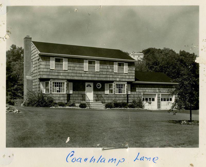Colonial-style house built in 1962 with shingle siding and a two door garage viewed from its lawn.
