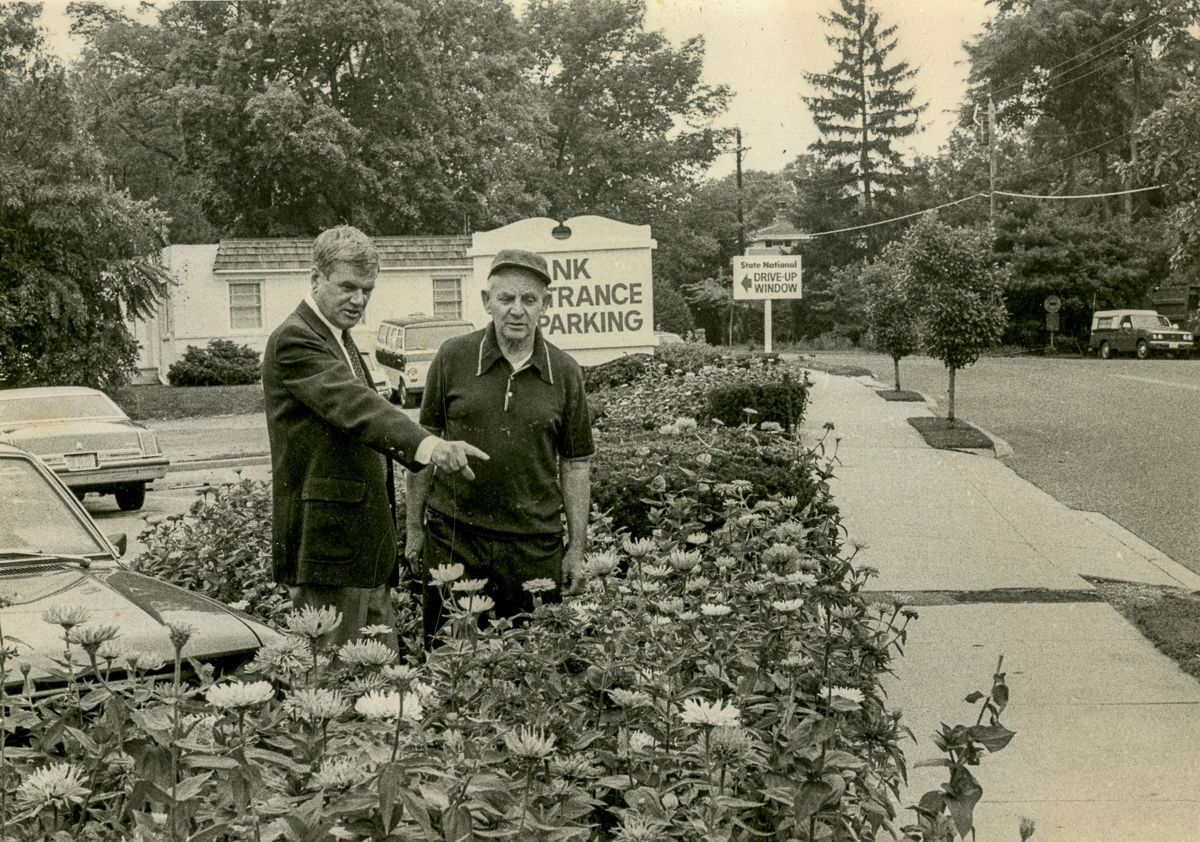 Two men admiring flowers planted along the sidewalk in front of the Cos Cob branch of the State National Bank of Connecticut.Collection