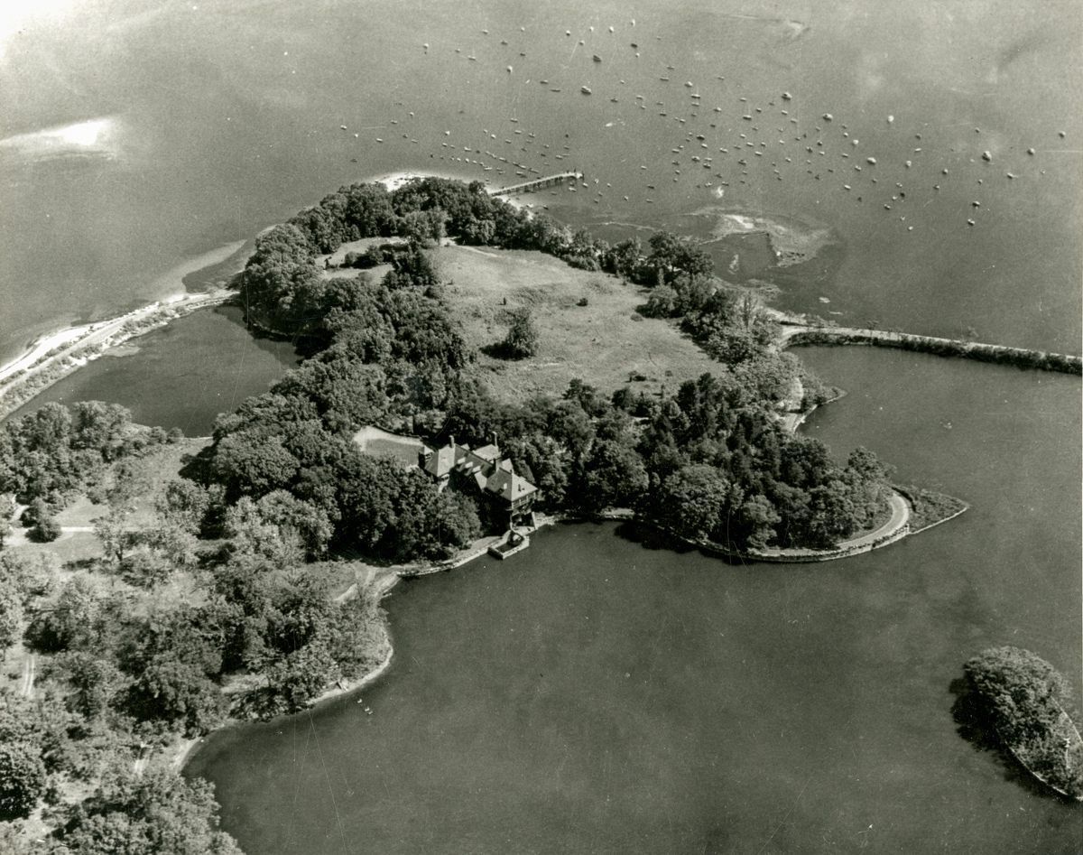 Aerial view of Greenwich Point looking north with the Tod mansion in the center of the image.Collection