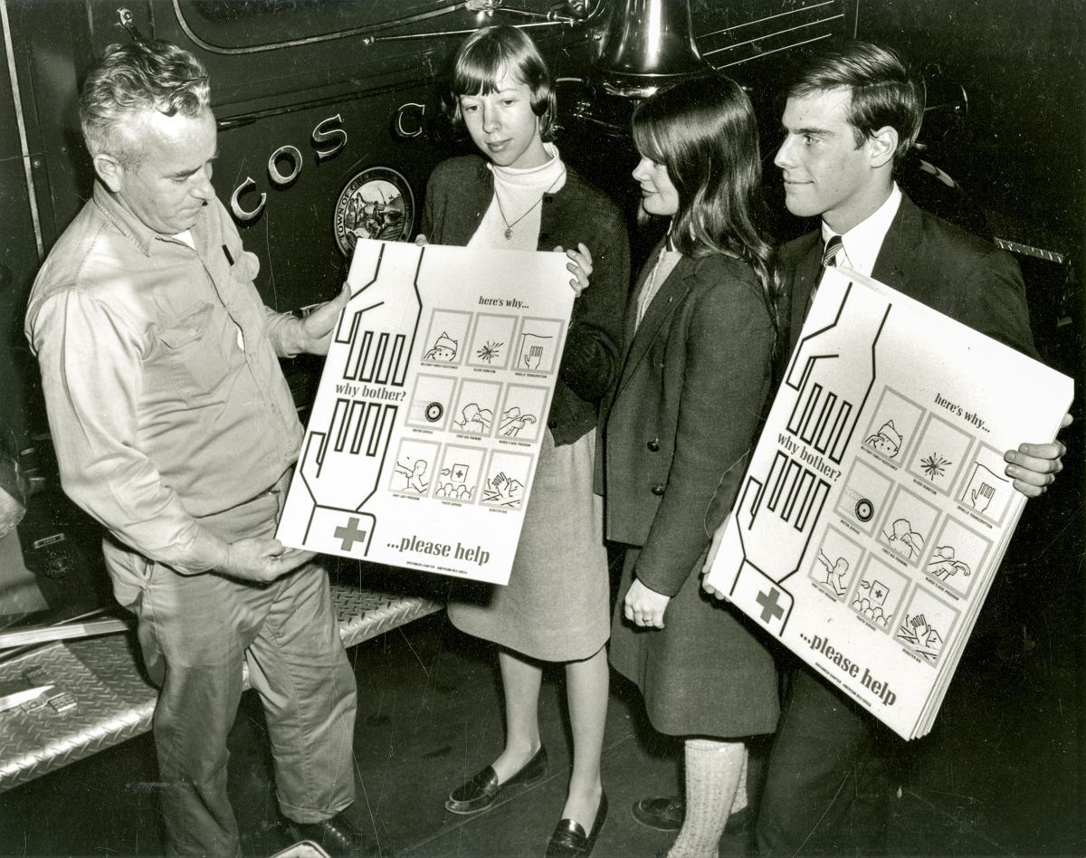 People standing with Red Cross poster's.