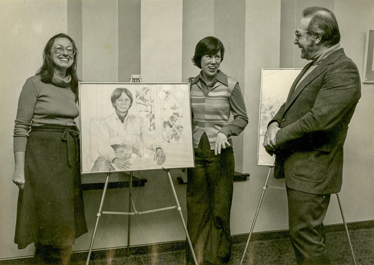 Left to right, Carol Dixon, Greenwich Art Society President and Chairman of the Arts at Greenwich Academy; Sister Kathy Kernan, photography and studio arts teacher at the Convent of the Sacred Heart, with her painting "Margo"; and Nicholas Mercede, chairman of the board of Eagle Tower, a Stamford retirement residence; all pictured at the Winter Show's opening.Collection