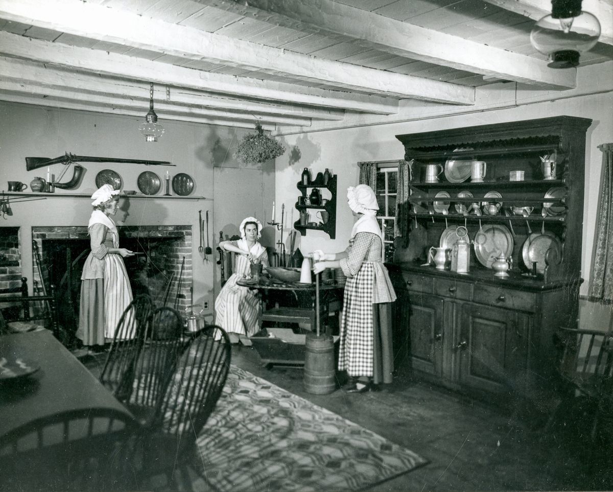 Three Junior League guides in period costume in the colonial kitchen of the Bush-Holley House.Collection