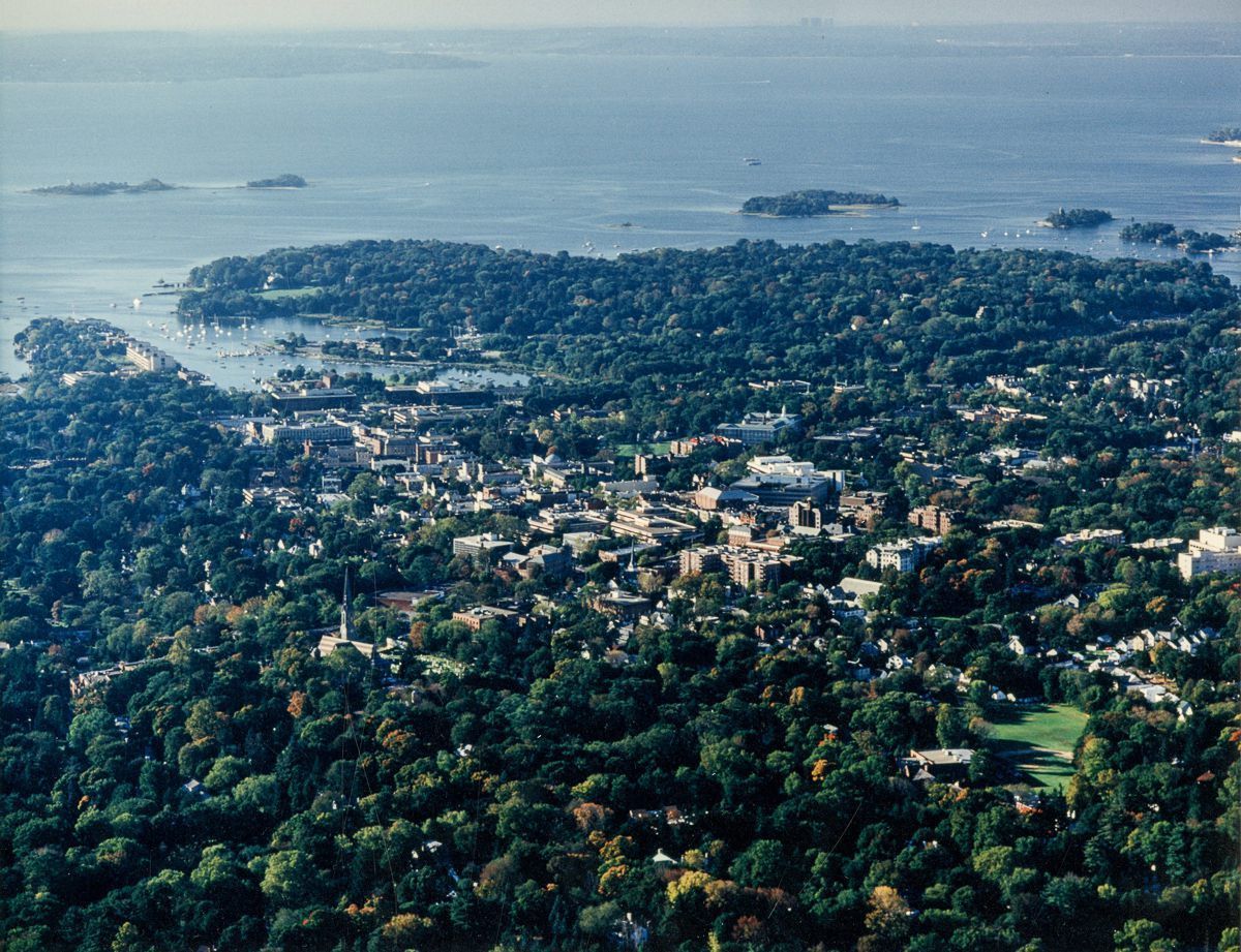 Aerial view, looking south across central Greenwich towards Long Island Sound.