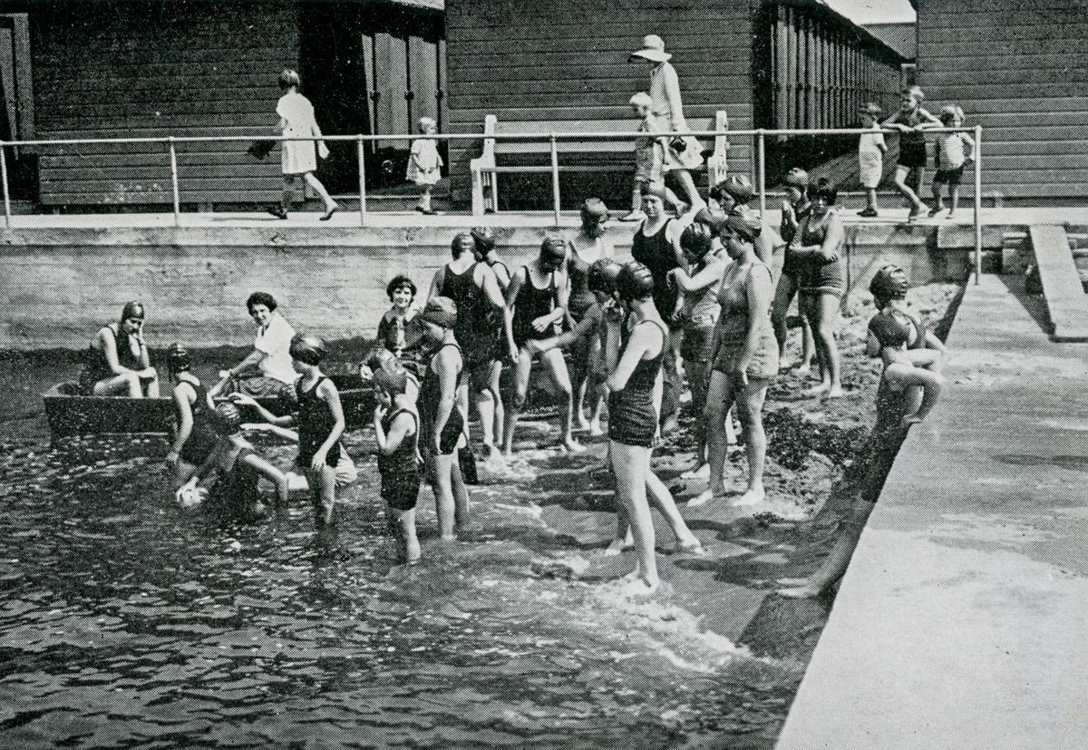 A group of girls swimming at the small beach by Rocky Point Club in the summer of 1927 when it opened.Collection