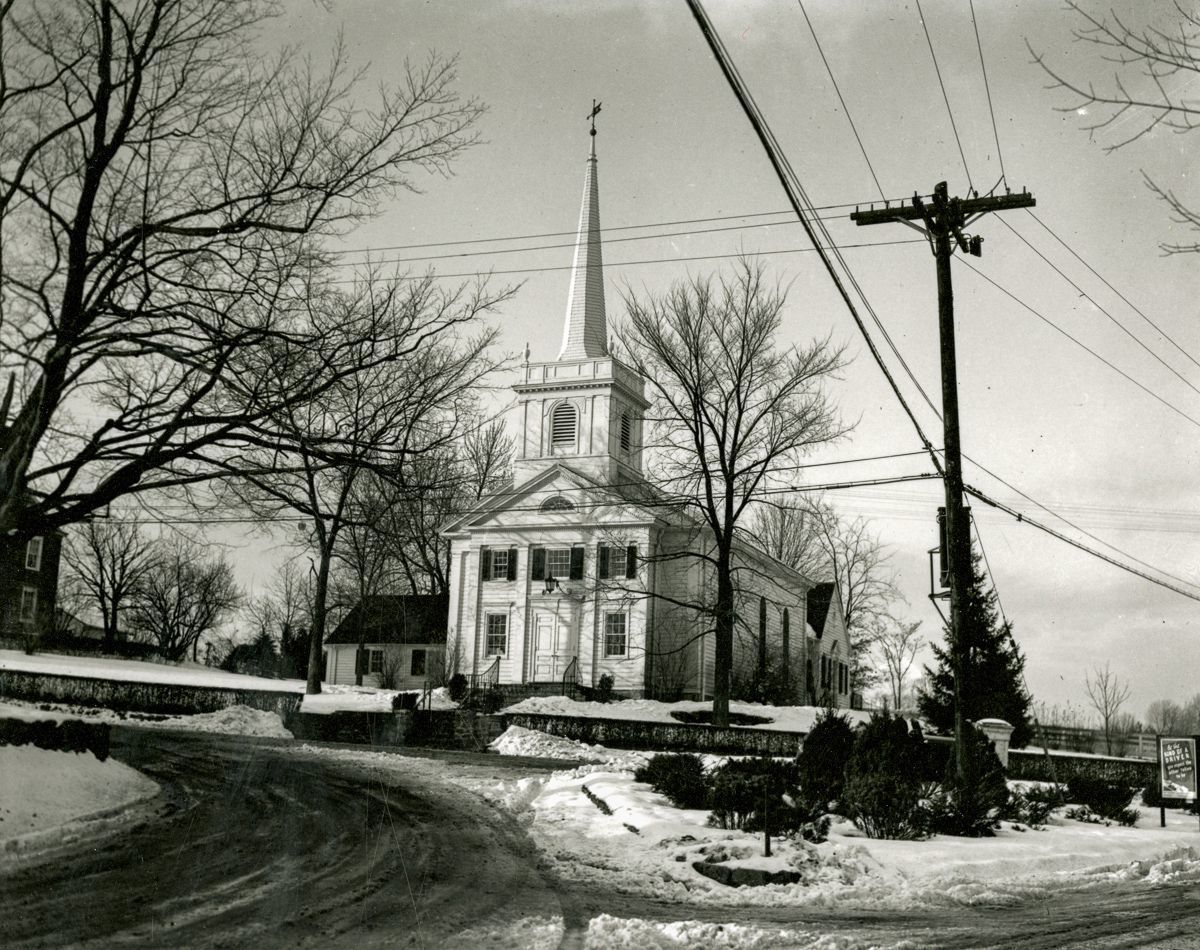 A view of the First Church of Round Hill in winter.