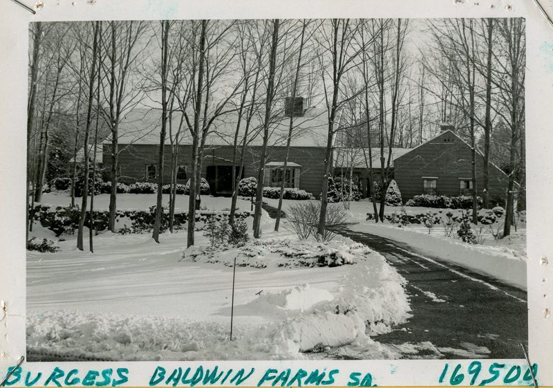 Single story Colonial-style clapboard house built in 1961 in the snow.