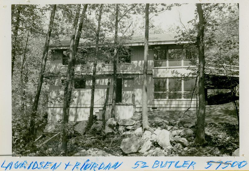 Contemporary house built in 1971 viewed from the bottom of the rocky hill that the house is built into.