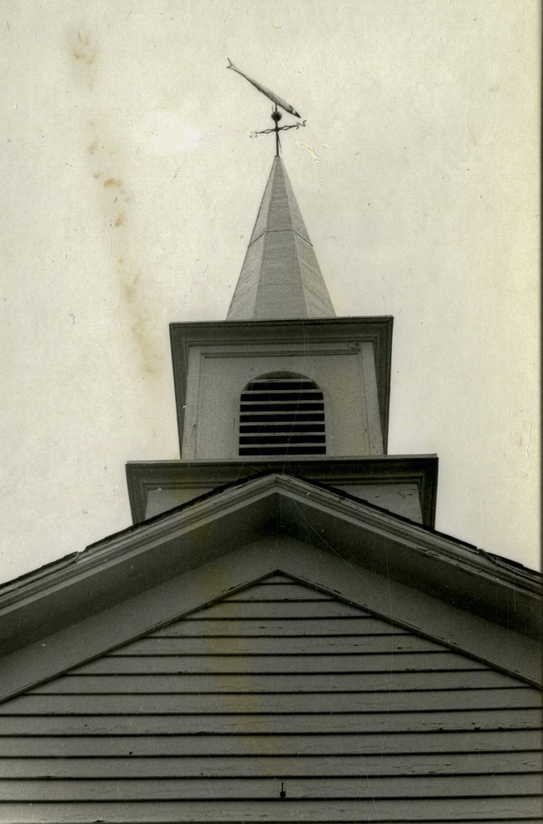 A close-up view of Dingletown Community Church's octagonal spire and fish-shaped weathervane.Collection