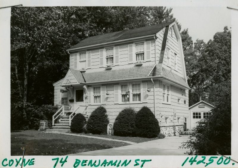 Three story shingled house built in the 1920's with a gambrel roof and a long second-floor dormer and a garage at the end of its driveway viewed from the street.Collection