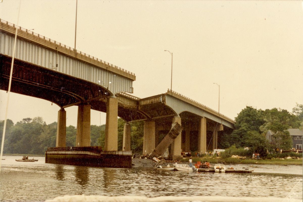 A view from Riverside of the Mianus Bridge after its collapse; a tractor trailer can be seen braced against a bridge pier after it fell through the road.Collection