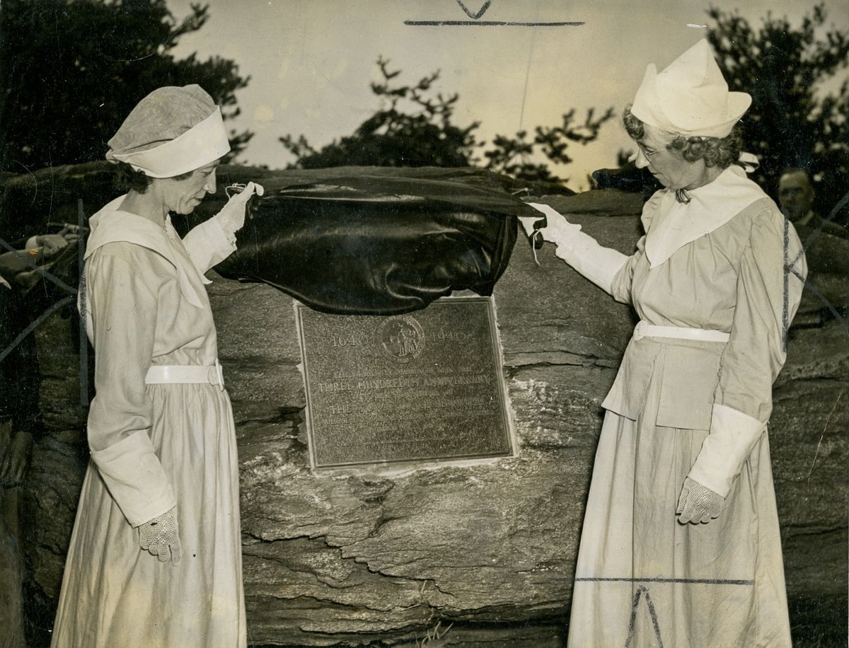 Josephine Feaks Griswold and Mary Feaks Norman unveiling a plaque on a stone that commemorates the founding of Greenwich in 1640.Collection