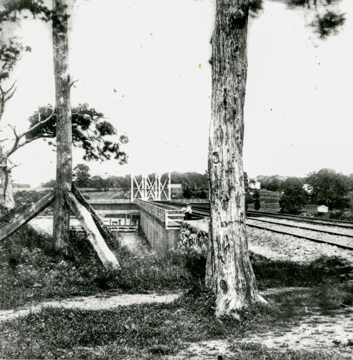 Unidentified railroad bridge in Greenwich that crosses a body of water.